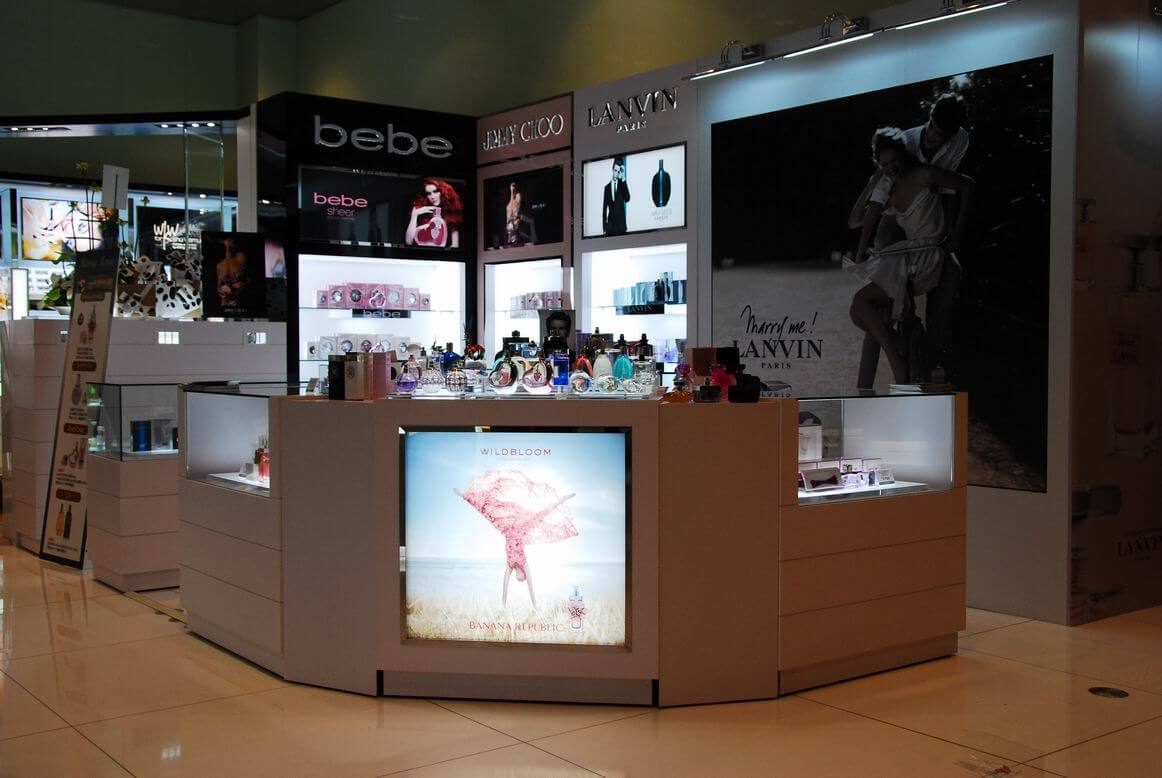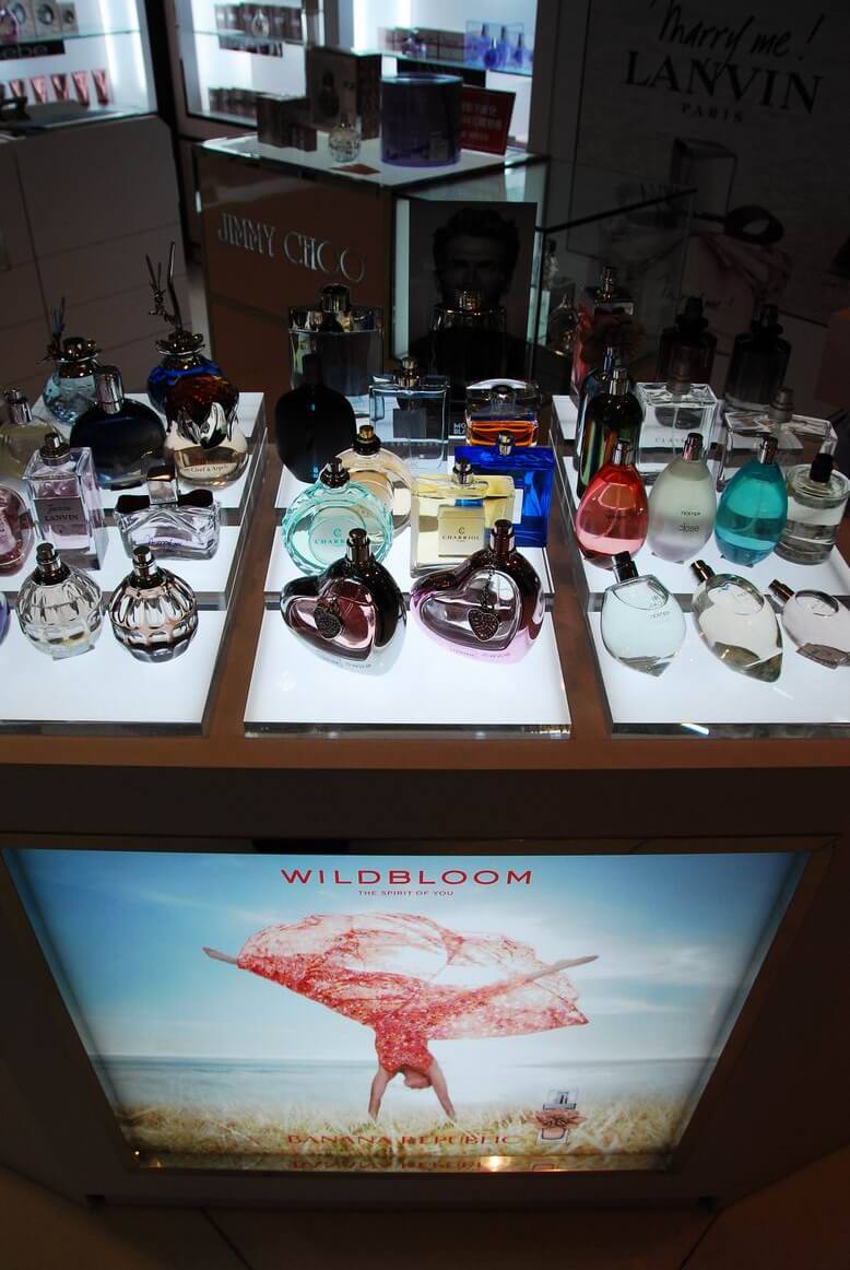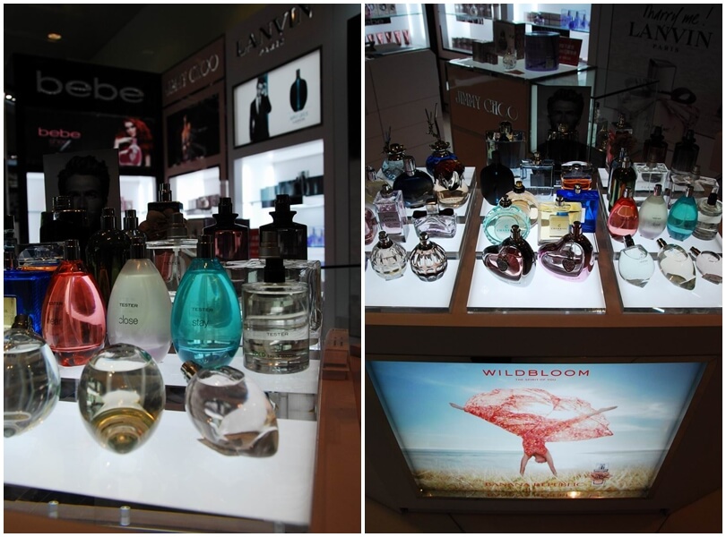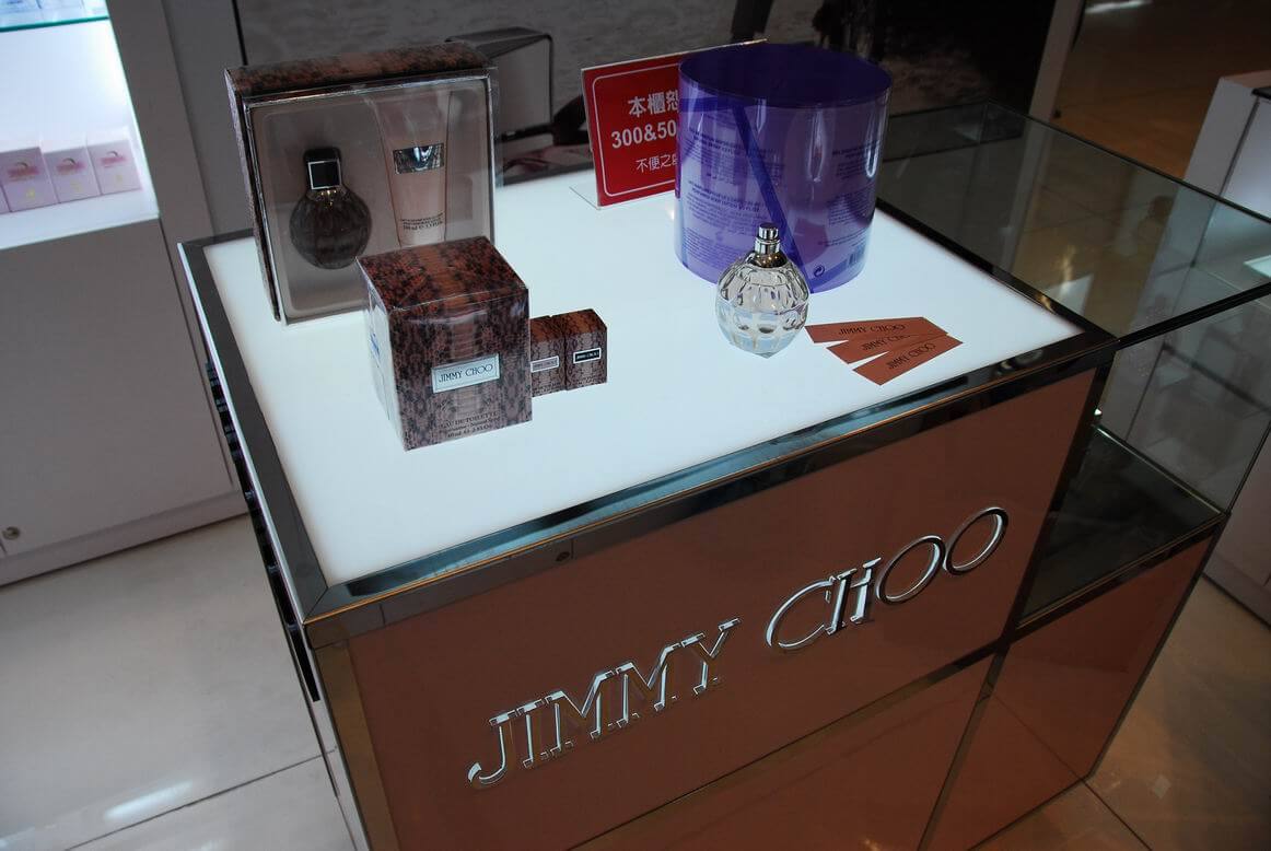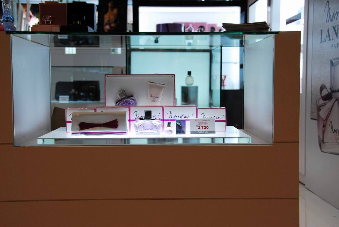 專櫃完工成果照,將多種品牌綜合陳列在同一個櫃位中。香水套組在玻璃展示櫃中的美麗模樣。櫃中打出的燈光效果配合灰鏡,美麗迷人。香水別緻的造型在櫃中閃閃發光。