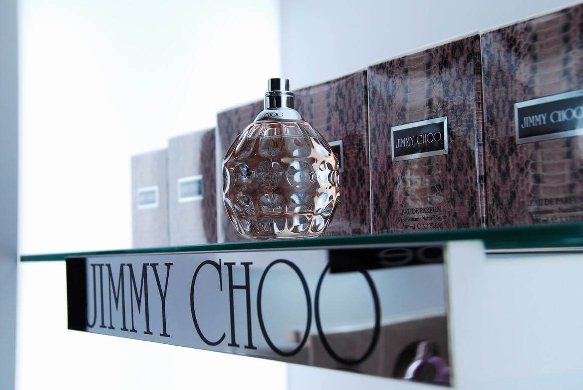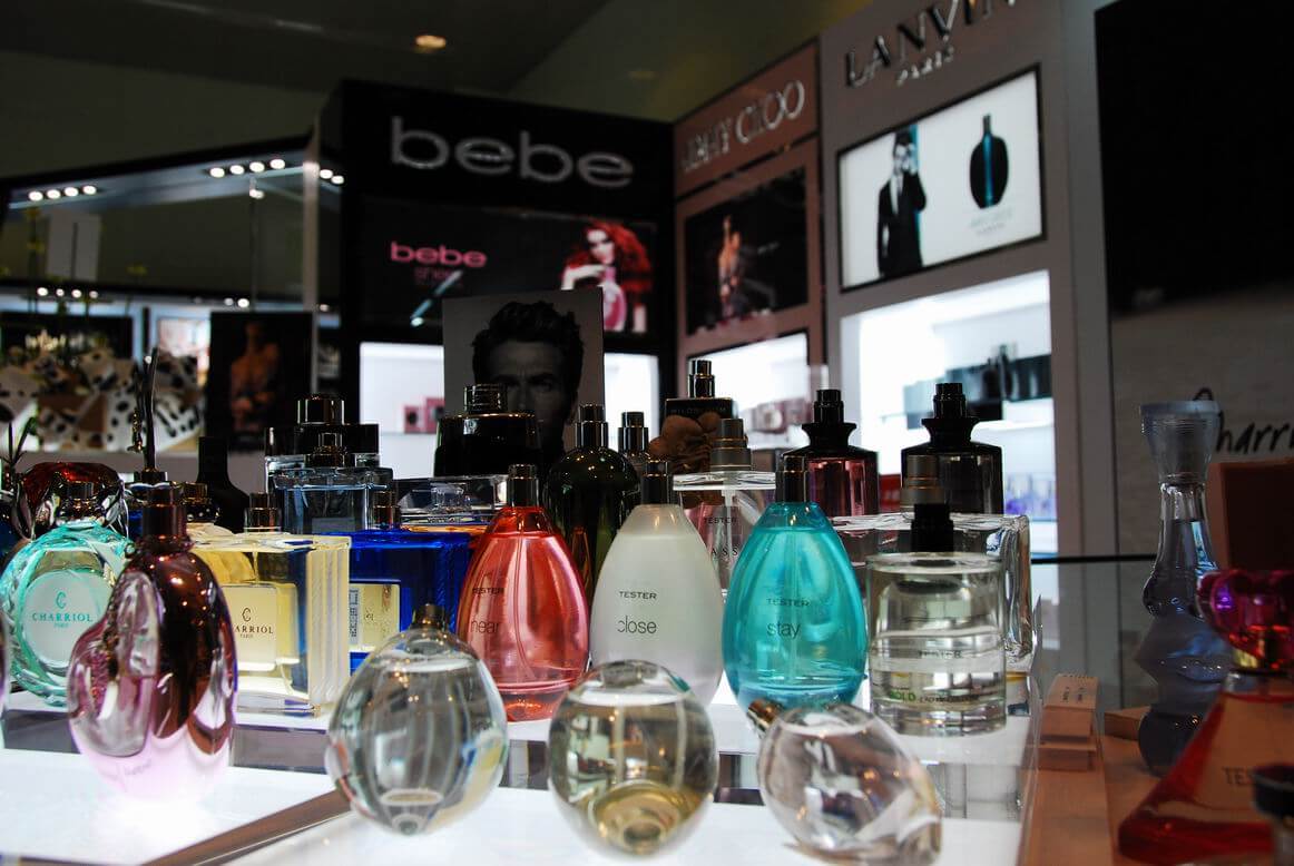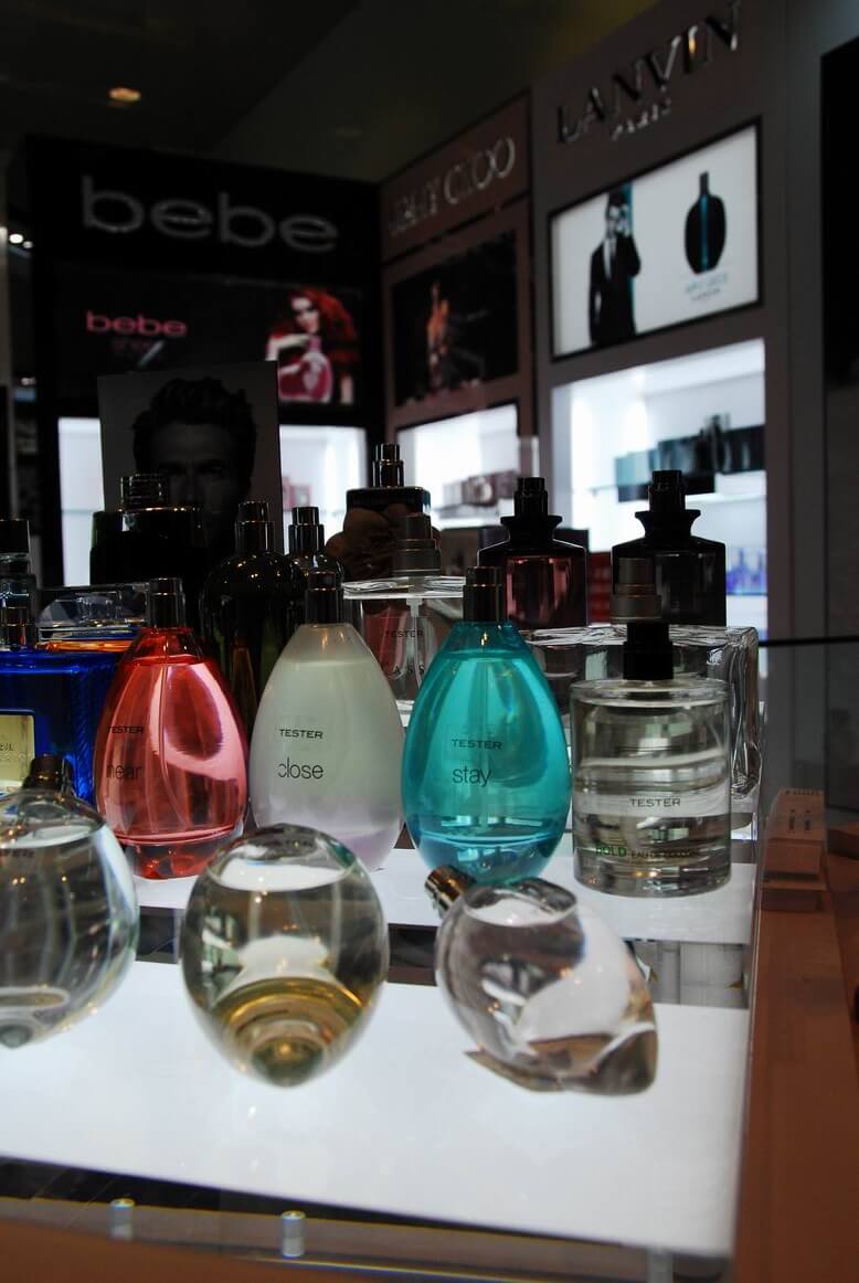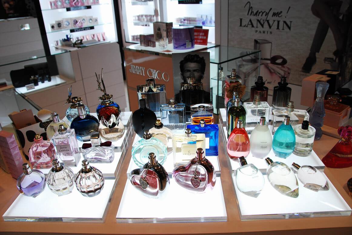 專櫃完工成果照,將多種品牌綜合陳列在同一個櫃位中。香水套組在玻璃展示櫃中的美麗模樣。櫃中打出的燈光效果配合灰鏡,美麗迷人。香水別緻的造型在櫃中閃閃發光。