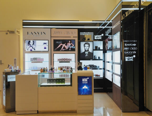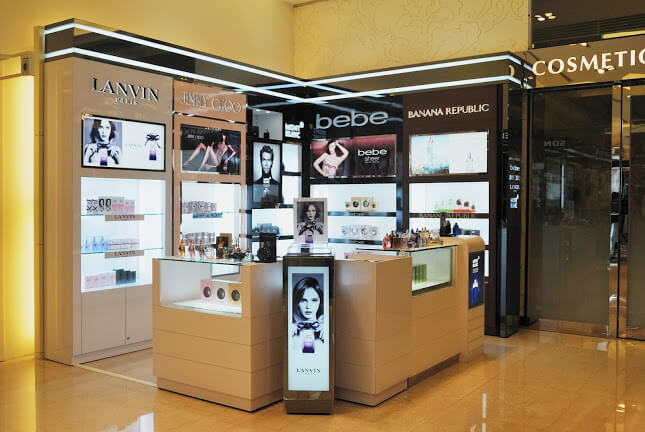 漢神巨蛋百貨美麗香水專櫃完成照,充滿立體層次高低的美感。從不同的角度,每個櫃子的變化更加明顯,各種不同的材質在設計師的巧手下,重新組合變化多端。櫃上的壓克力因香水的排列而設計。