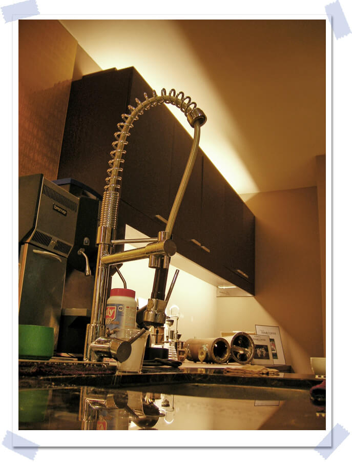 白色噴漆、木皮染色、美耐板、塑膠地板、玻璃、壓克力、LED軌道燈、水泥粉光